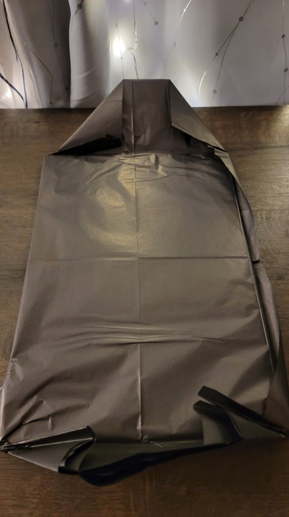 My order was packaged in a black box slightly larger than the size of a Gemini mailer. It was wrapped in “fragile tape” and shipped all the way from the United Kingdom. Being a single layer of cardboard, the box arrived flattened on one side, but the contents arrived in good condition. Everything was wrapped in all black tissue paper and the book was bagged and boarded. I nearly missed a black envelope containing a print under the book due to it blending in with the tissue paper. A nice touch was a signed handwritten thanks of support that was included. I found the all-black packaging to be a nice touch to add to the overall theme of the book, and I wonder if it is the routine theme from Reload Comics.