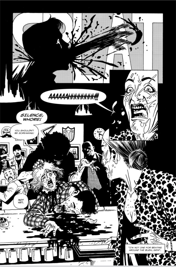 The gritty black and white art assists with the dark and sinister mood of the book. Rossi provides interesting layouts, effective line art, detailed backgrounds, and uses deep shadows to help tell the story. It was only after reading Storm’s blog (here) that I appreciated what Rossi did for the book more fully. In the blog, Storm shared the photo references he provided to Rossi, and looking at these pictures, he really nailed the likeness and the time period. There were times when I would have liked to see panels in color as the book has a decent amount of blood and gore. Colors would certainly have provided greater impact for the blood and body parts, but this would be to the detriment of the overall dark feel that is the best part of the book, so it is a bit of a toss-up.