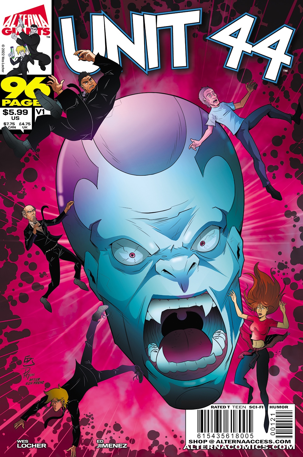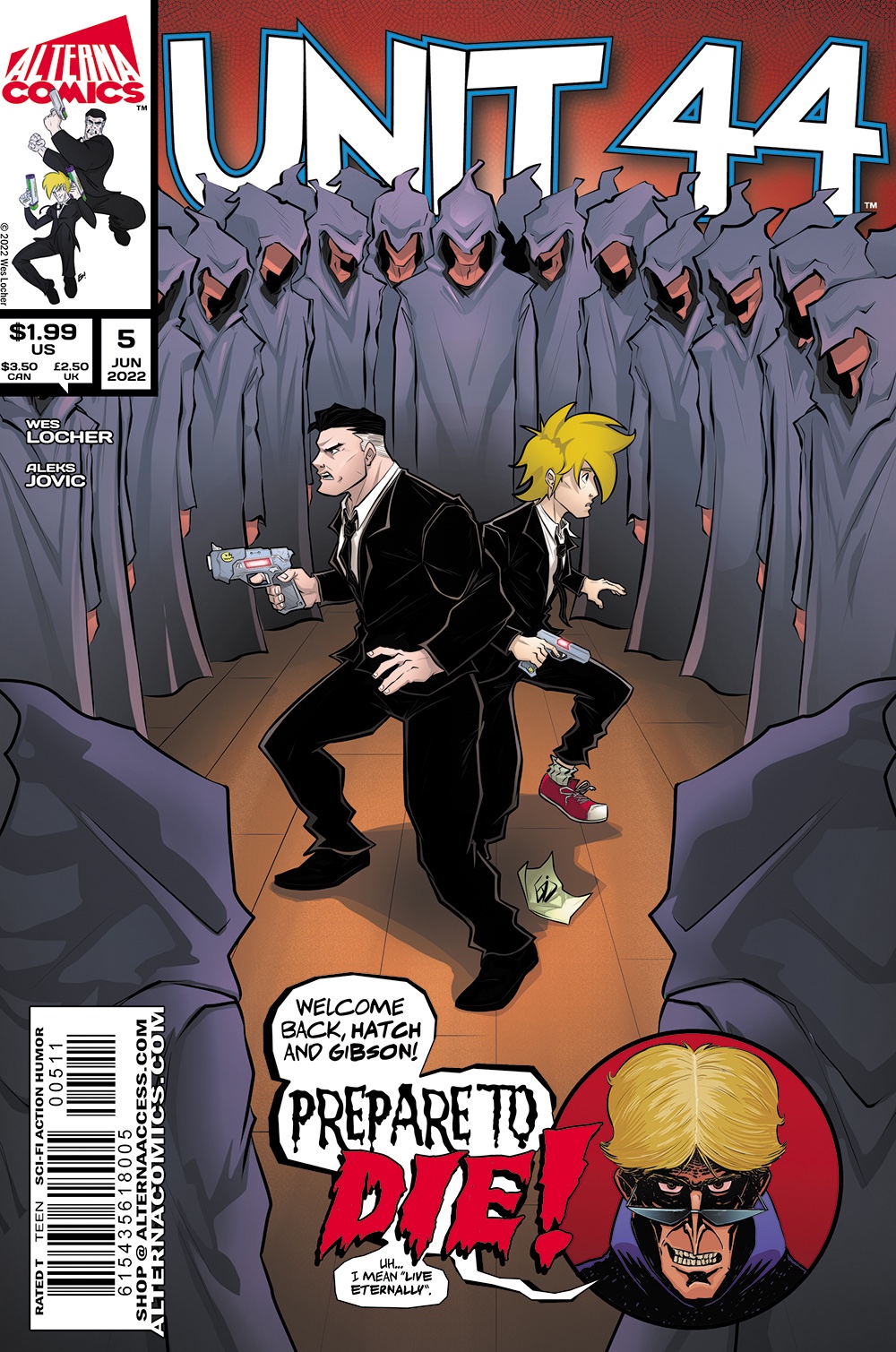 • UNIT 44 #5 (Returning with a NEW artist and a NEW ongoing format! The Blood Moon Cult has moved into town and its ranks are quickly filling up, forcing inept Area 51 Agents Gibson and Hatch to infiltrate the group to uncover their secret plans. Sci-Fi Action Humor; Wes Locher, Aleks Jovic, Andrew Pate, Ed Jimenez) (Teen)