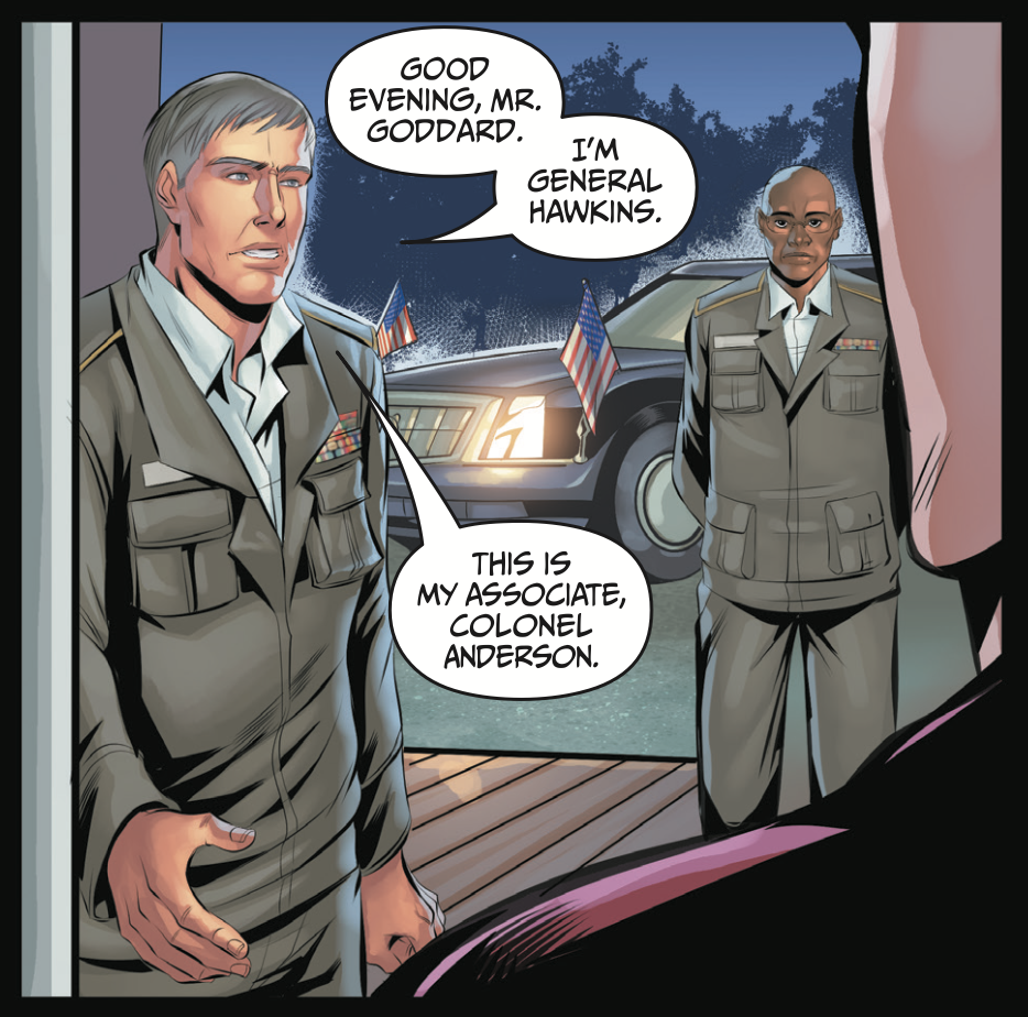1) General Hawkins changes branches from the US Army to the US Coast Guard when the Department of Defense realizes they can work around posse comitatus by having the heroes work for the USCG. This is briefly mentioned in one of American Eagle’s speech balloons but not explained fully. A complete transcript of the secret meeting where this is all decided is found in the RPG and might be added to the comic if we hit our stretch goal to add pages.