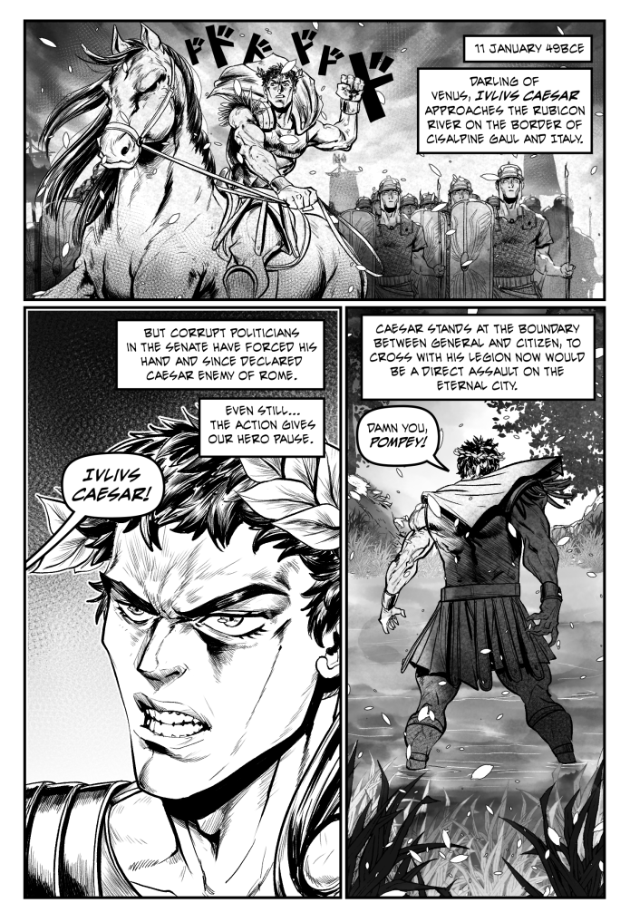 Last Friday, 9 Realms Publishing launched a crowdfunding campaign for SPQR’s Bizarre Adventure: Rubicon Invaders, an over-the-top comic book retelling of the Roman civil wars inspired by the JoJo’s Bizarre Adventure manga series.