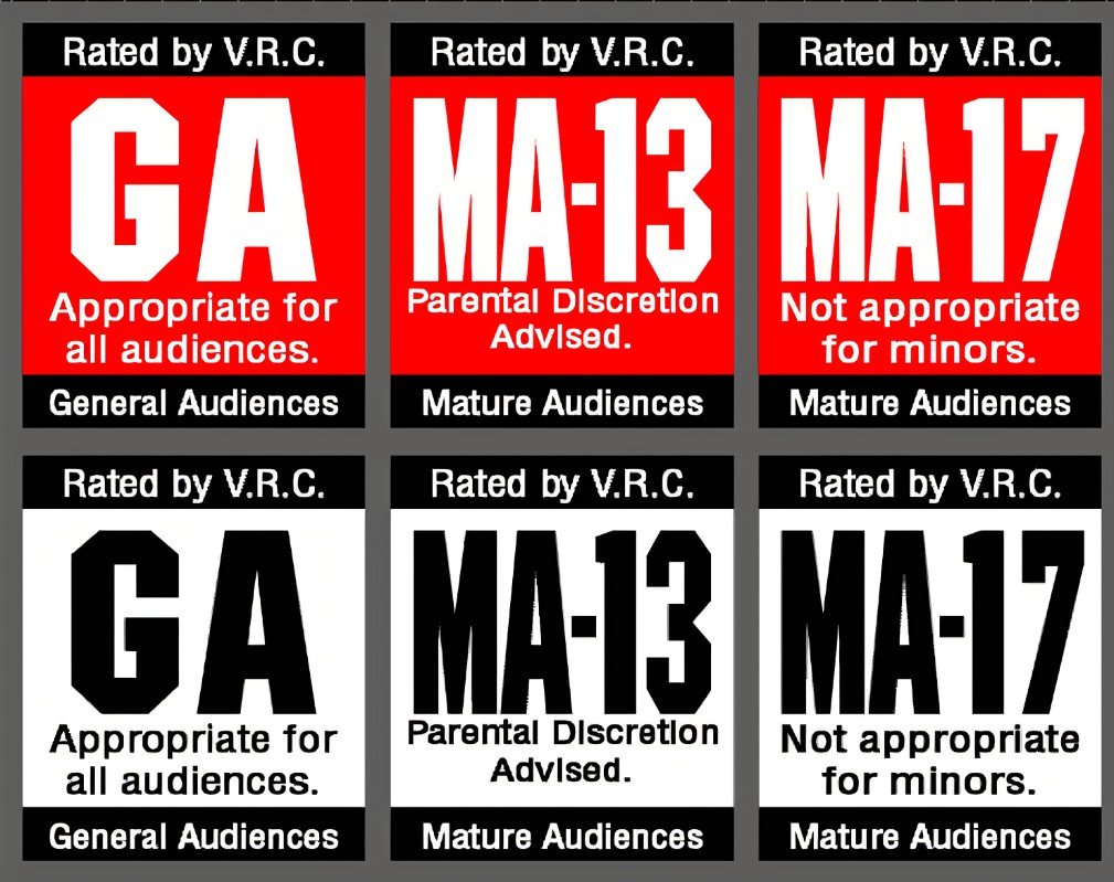Now let’s put this into context and group the lunacy that is the many labels that the ESRB uses with the ones from the V.R.C: GA (General Audience) = EC + E (Early Childhood, Everyone) MA-17 (Mature Audiences) = E-10 + T (Everyone 10+, Teen) MA-17 (No minors) = M + AO