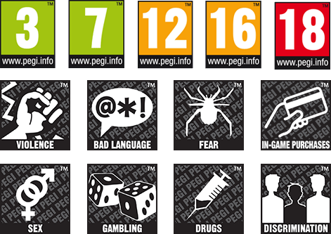 So now we come to the Pegi rating system in Europe, which is less… cluttered, unlike the ESRB, but then it gets really pointless when you start adding frilly fucking pictures as your relay of the content/themes for these games. Much like ESRB, it too is loophole crazy!