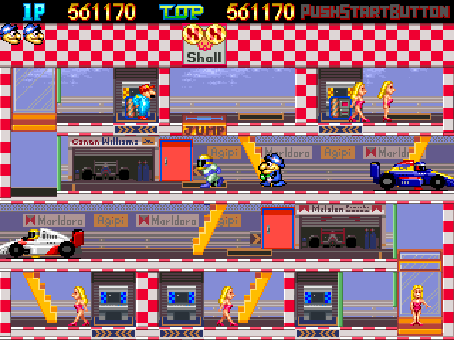 “Pipi & Bibi’s” (also known as “Whoopee” in Japan) is an arcade video game developed and published by TOAPLAN in 1991. This game did not reach the fame of other TOAPLAN creations (such as Truxton, Zero Wing or Snow Bros) probably because of its erotic motifs, which caused many arcades to refuse to buy and exhibit this game in their shops.