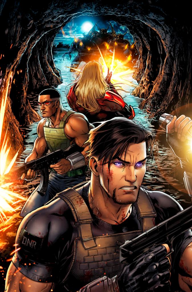 The title story of Grand Bizarre is a 50-page adventure written by Richard C. Meyer and features illustrations by Aaron Alfeche, and it acts as a prequel to the other Jawbreakers books released so far. The story largely follows Silkworm, who is between military contracting gigs, largely because of his delightfully dickish personality. He quickly gets a small redemptive moment, though, after he literally jumps into harms way to assist a unit in distress.