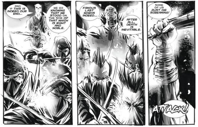 If there is any other issue that could rival the nebulous artwork of the action sequences, it is the lettering. Not only are there several typos throughout the book, but some of the word balloon placement is odd too, often making it difficult to follow from speaker to speaker. There is a little bit of transliterated Japanese peppered throughout the book, too, but nothing so important that non-Japanese speakers will get lost. (“Yes”, “Good morning”, etc.).