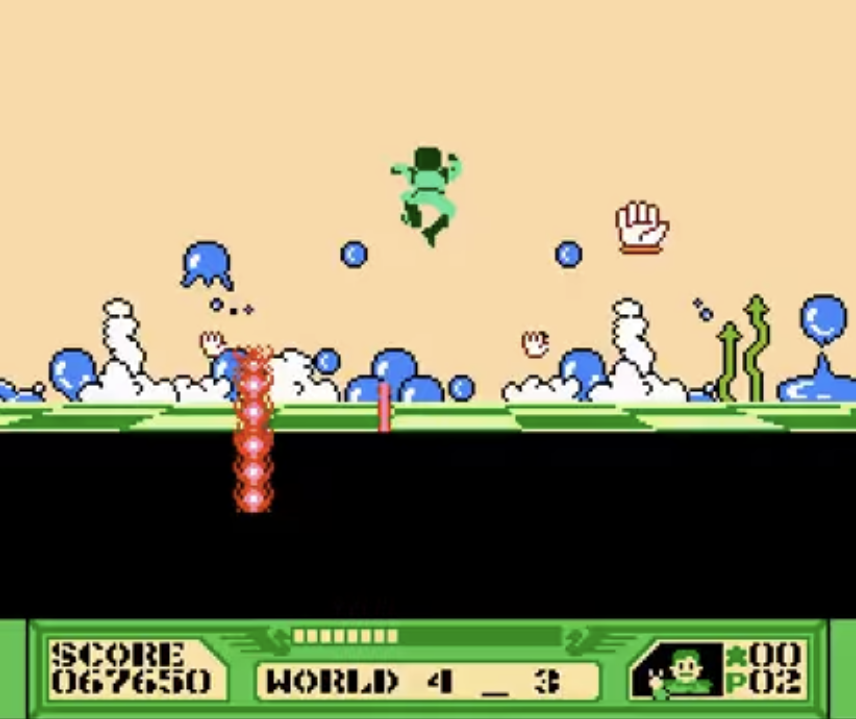 First of all, you acquire power ups hidden in various pillars scattered about the stage, which include an extra hit, invincibility, extra lives, balloons that take you to a brief bonus area, and rockets (which provide limited ammo to knock out enemies). There are also poison mushrooms hidden in these pillars from time to time, which you will have to avoid or you’ll die.