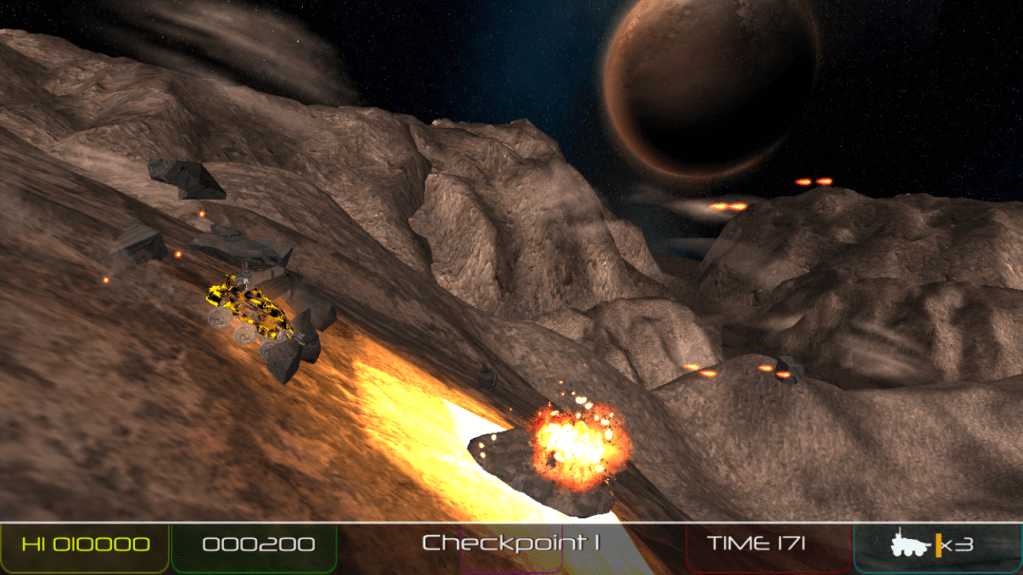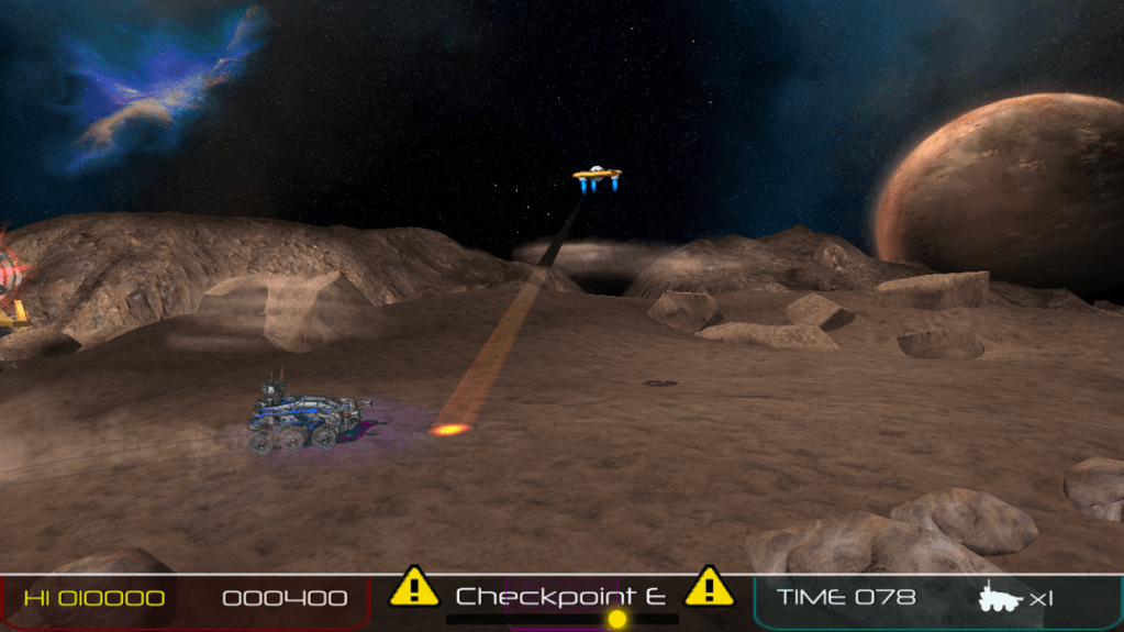 Aesthetically, The Milky Way Chronicles looks to have decent, but certainly not mind-blowing 3D graphics. All of the enemies and terrain features are fairly small, though this makes it easier to see things coming from a distance. The in-game soundtrack is basically an updated version of the original Moon Patrol’s music. It’s very upbeat and still has a retro tenor to it, and lends itself to the action fairly well.