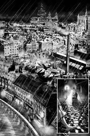 The environments around London are even more impressive than the characters. The streets and architecture of the era are deftly recreated in a way that seems authentic (I say “seems” as I don’t have any first-hand knowledge). In any case, the artwork successfully creates a foreboding “sense of place,” and the strong chiaroscuro adds to the haunting mood and activates the reader’s imagination on what might be hiding in the shadows. This is perfectly matched with the black pages, which look black along the edges, too, giving the book itself a lot of character.