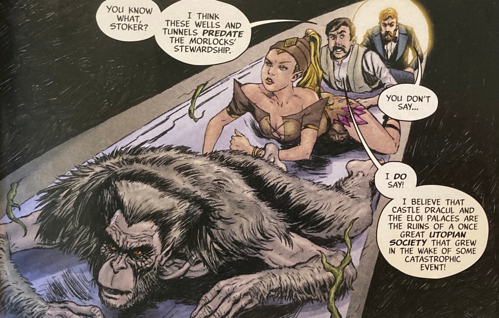 Here’s where we really start to enter some spoiler territory, so I’ll endeavor to be as nonspecific as possible. Stoker and Wells find themselves confronted with a centuries-long war between the humans of the future and the bestial, apelike Morlocks. They befriend members of each group, and use their help to confront giant underground moles, subterranean crabs (Crab People!), and the vampiric mastermind of this future society’s ills.