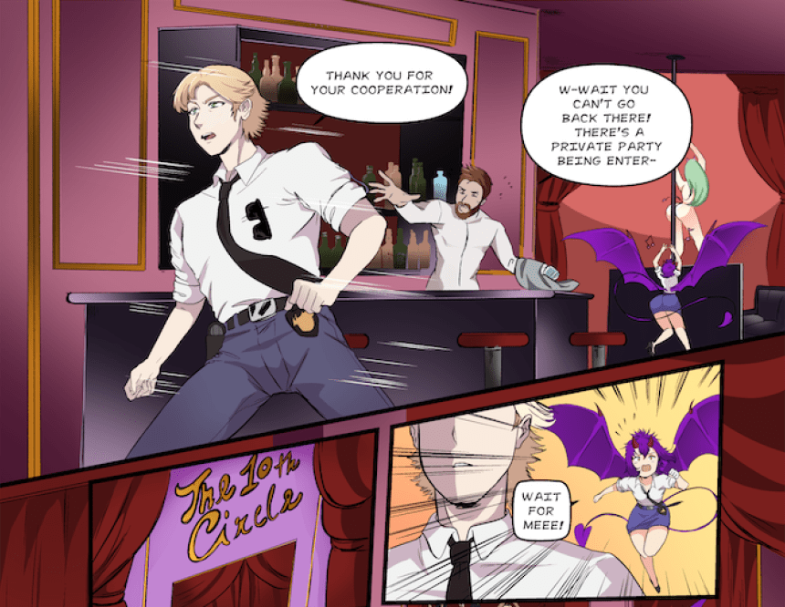 TS: Other than the fetching demon ladies and the comedic antics that follow them, there is also a larger mystery at play in the SuccuBUSTED! story. What can you tell us about the overarching conflict, particularly the villain(s) at work (the Demons of Greed)?
