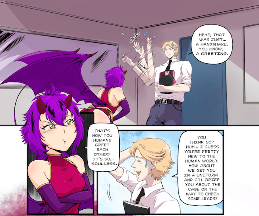 Isaac Fox: The lust-filled antics of Rita. In issue 1, we established the universe as well as Rita’s motives, but we didn’t get to see a ton of her personality. With Rita now serving as Liam’s partner on a demonic criminal case, we’re in store for plenty of lusty antics from this callipygous succubus. She’s a demon in love, but she’s a demon of lust. As such, she’s attempting to win Liam over with what she knows best — lewd and lascivious displays.