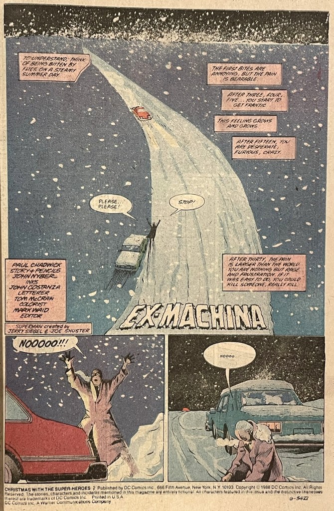 The first story – titled Ex Machina – was written and pencilled by Paul Chadwick (of Concrete fame) and inked by John Nyberg. It centers on a stranded motorist at the end of his rope. Stuck in the cold in a broken-down car, on a long and winding road in the middle of the night and suffering from a debilitating medical condition that makes the cold extremely unbearable, he decides to end his pain and suffering by committing suicide. Suddenly, as he is about to pull the trigger, he hears a tapping on his window, and he turns to see Superman. Superman doesn’t fly him to safety. No, he sits with the stranded motorist, helps warm him and talks to him and even more importantly, listens to him. He hears what the motorist is going through and offers ways to help, ways in which Superman’s powers aren’t really needed. This is a story of how one person can help another, and it didn’t require super-strength or flight. Yes, perhaps some x-ray vision was used to diagnose the problem with the car, but ultimately it was Superman’s character that saved the day.