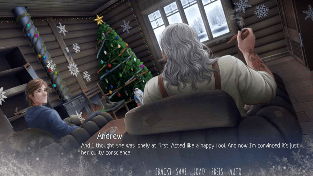 That said, there’s not much variety in the accompanying visuals considering that so much of the story takes place in a single house. Most screens consist of static talking heads (Andrew and Julia) with a wood cabin interior backdrop. There are very few images where the characters are actually interacting with one another, and some very obvious opportunities for visual storytelling are missed. The most obvious scene was where Andrew and Julia are looking at her grandmother’s drawings on a wall, and the player is given a static image of the characters lying on the floor rather than a shot of the drawings themselves. Even for a short game experience (about 2-3 hours or so), you will likely get bored with the visuals unless you are particularly taken by the design of one of the two main characters.