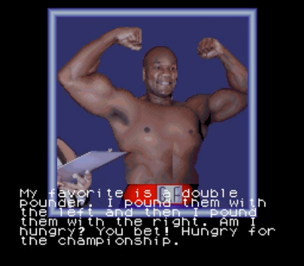 That’s not to say that the game is ugly. It actually looks pretty good, all things considered. The characters are a decent size and the musculature of the fighters is well defined using all of those wonderful colors that the Super NES was so famous for displaying. The fighters’ facial close-ups help fill the screen, too, and seeing them deteriorate as they take a beating was a nice touch. There are some digitized images of George Foreman himself peppered between matches, often coupled with some kind of quip about eating, which were undoubtedly a high graphics mark for 1992.