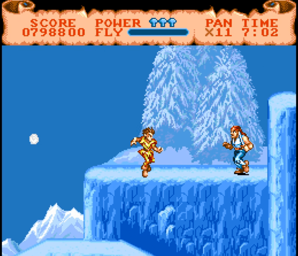I simply don’t see much inspiration or imagination in Hook. It’s as if the game designers had broken down what other platformers had done and plastered extra creamy Peter Pan all over it. Let’s take the background design first: Yes, the final pirate town stages were OK, but let’s go more generic. A forest? Check. Cave? Check. Vertical cliff level? That’s a check. Another cave? Double-check. Obligatory ice level where everything is slippery? Czech. (Hah! Mixing it up to keep you on your toes like a goddamn pro!)