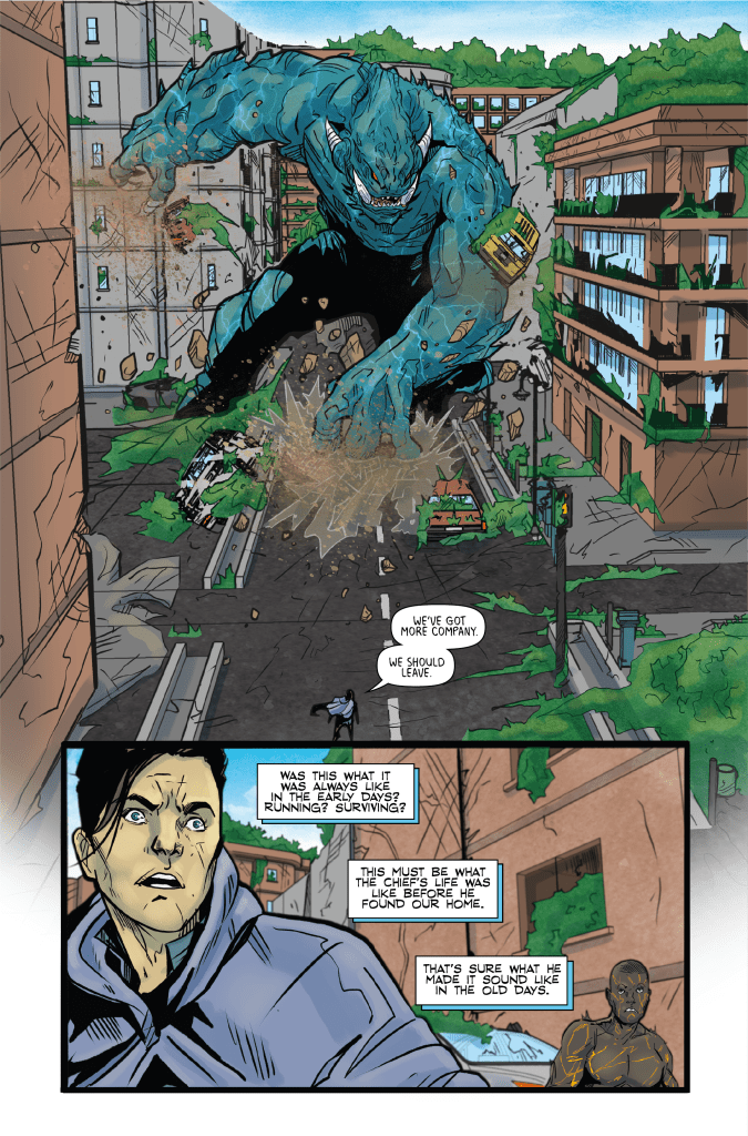 Issue #2 picks up right after the shocking cliffhanger from the first issue. Join the heroes as they are stranded in the wasteland and will find new tribes, fight new kaiju, and face new dangers.