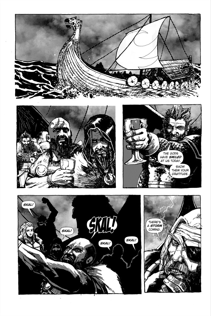 Is a 20 page black and white comic book (16 pages of story plus bonus material) about a band of Vikings who get caught in a storm and wash up on a mysterious island.It features 2 interconnected stories, the first is about Viking raiders that get caught up in a storm that destroys their ship. The remaining survivors then end up making it to the shores of a mysterious island.