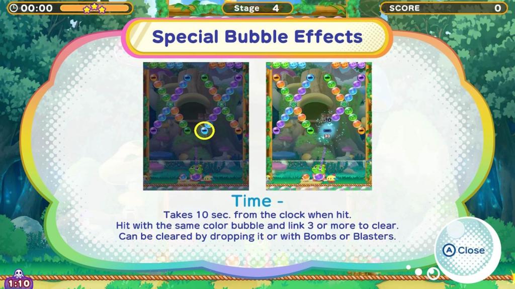 Each stage is set up a little differently. Some are more puzzle-based and will give your brain a workout, while others are pretty straightforward, puzzle-ish blasting action where you mostly need to pop to beat the clock. Also included in the Story mode is the Baron’s Tower mode. This is set up more like the original Puzzle Bobble where you just play as long as you can keep popping bubbles until they reach the bottom of the screen, seeing how high of a score you can attain. Strangely, this is the only place that actually has leaderboards in the game. There are some unlockables for achieving certain high scores in this mode, too… but I wasn’t good enough to unlock anything, yet. I still need a little more practice… and luck! To be fair, looking at the leaderboards at the time of this writing, only one person out in the gaming space has actually scored high enough to unlock the next mode. It gets frantic, I tell ya’!