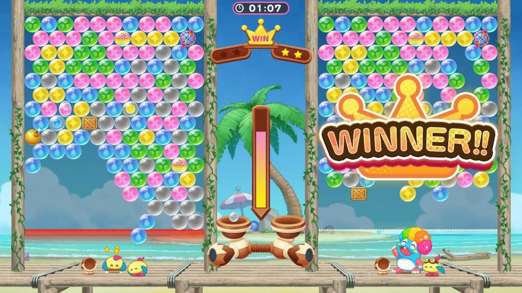 Some levels you’ll be playing over and over to master (unless you are already a Puzzle Bobble master, I guess), though if you keep struggling in the Story mode, you can choose to replay a failed level with an assist that extends your guide arrow to show you exactly where a bubble will land. This helps, but it limits your final reward for the stage to just one star. If you want those EX-stages, you’ll have to get good at mastering the stages yourself… or with the aforementioned help from another player/CPU player. And for those who rise to the challenge and are able to complete all of the EX-stages for a level, you are gifted with that level’s music in the Memory Album under Settings. The Memory Album also includes the characters you have unlocked in Vs. mode, and the skins you unlock for your little “mini-helper” that holds onto any special bubbles you free up to use later as an on-demand power-up.