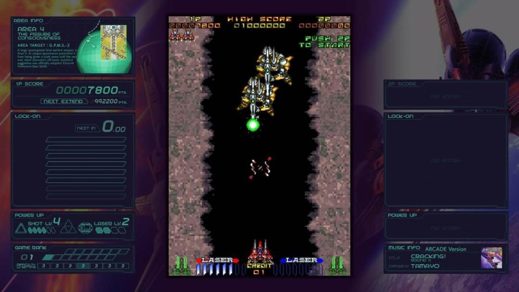 Back in the day, I had the Saturn and PlayStation versions of these games, and while Ray’z Arcade Chronology are the original arcade versions, the differences are minimal outside of RayCrisis (arcade) has two-player and the PlayStation port did not. Otherwise, Ray’z Arcade Chronology has some modern updates we’ve come to expect in recent re-releases. For one, you have unlimited credits on every game in the collection, so even those of us who suck at these games can still push through to the very end. There is a save-state ability to save anywhere you like, so if you are trying for a perfect run to get the best ending, then that makes things quite a bit easier.