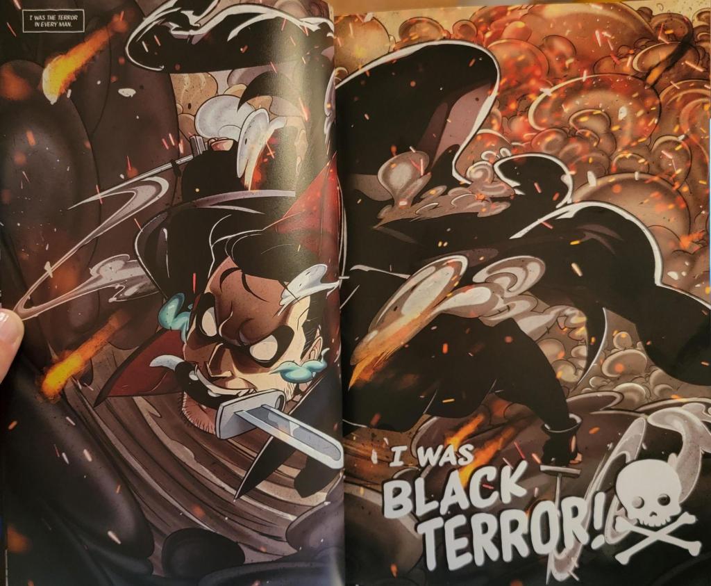 More than 2 years after fulfilling Monster M.D., the creative team at Rise Again Comics bringsTerror in the Trenches to the masses. Needless to say, I looked forward to this book. It had the same ‘dream team’ of Klaus and Maccagni, as well as Tiago Barsa on colors and Eric Weathers on letters. This story is a reimagining of the Black Terror, a public domain superhero character (originally published by Nedor Comics in 1941). Rise Again Comics’ version takes place roughly 30 years after one Dr. Robert Benton (psst! aka The Black Terror) retires from his World War II-era escapades in the military and how his quiet life was blasted away, literally. Because of this, he needs to go back to the old version of himself (a very scary badass) to seek answers… and revenge, naturally.