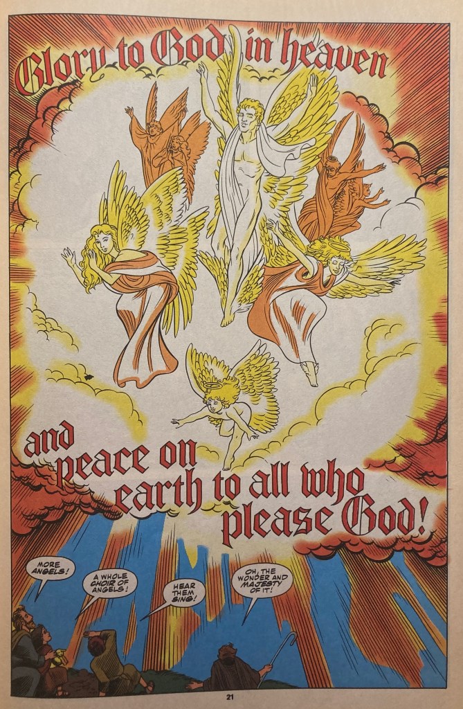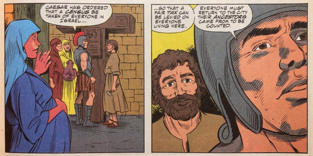 On the art side, the line work does a nice job of accurately representing the world. I appreciated the attention to detail on some of the depictions, particularly the angels. They are are shown with six wings, including two on their feet, likely inspired by the description of the seraphim angels in the Old Testament Book of Isaiah. The pacing, as mentioned above, is rather quick, and sometimes the choices for the panel layouts struck me as odd. For instance, the arrival of the angelic hosts speaking to the shepherds received a full page splash, but the actual arrival of Jesus is covered in a much more cluttered, non-dynamic way, and is still only given one page.