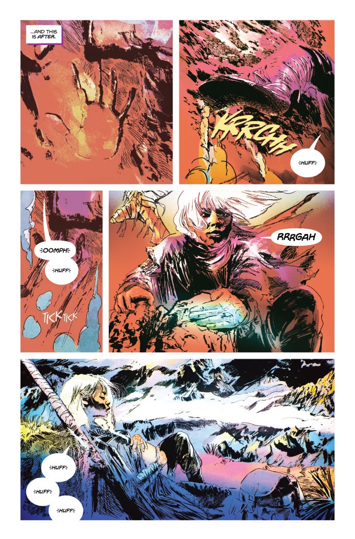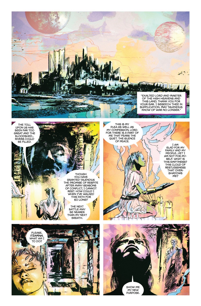The Fabled Offering is a 44-page sci-fi fantasy one-shot epic about a lone princess on a harrowing quest to save herself and her kingdom from her own past trauma. Attempting to reach the peak of Gefyra Mountain while carrying her unborn child, Grand Princess Aurelia of Talendius will stop at nothing to meet The Ancient Cizin aboard their starship, the Idis. Will Cizin accept her offering?